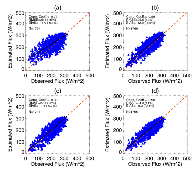 Figure 4. Evaluation of daily surface downward SW radiative fluxes from satellite estimates against PIRATA buoys for 2004: a) WHOI; b): UMD/SW_DX; c): UMD/SW_MODIS); d): UMD/SW_DX bias corrected  (black line is the best fit line).