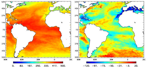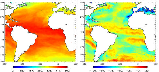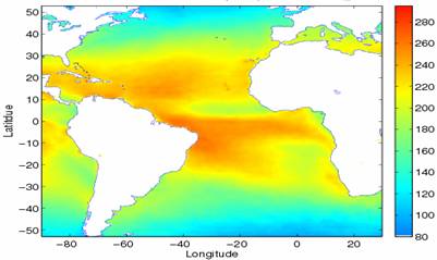 SW↓ Radiative fluxes were produced over the Atlantic Ocean for about ten years based on ISCCP DX at 0.5° spatial resolution at daily time scale (Figure 1). They are produced by UMD/SRB model Ver3.3.3 from Jan 1, 2003 to Dec 31, 2005.