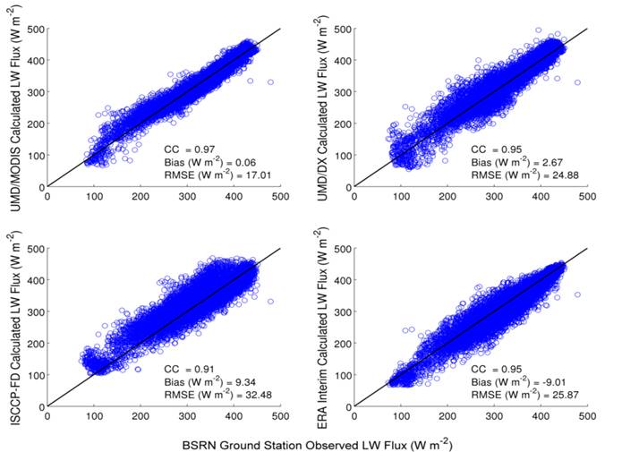 Evaluation of the LW fluxes as derived from MODIS, ISCCP_DX/UMD, ISCCP-FD and ERA Interim for the year 2004 is shown in Figure 9. Evaluation against ocean observations was not possible due to lack of data.